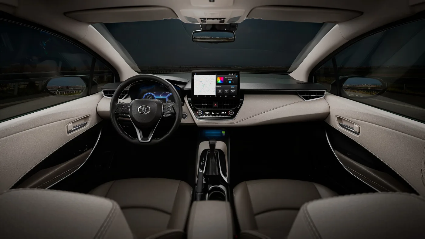 Ar-condicionado digital automático, central multimídia de 9″ com conexão Android Auto® e Apple CarPlay®. Painel digital de 7″, saída de ar condicionado com duas portas USB-C para passageiros traseiro, volante com controles de áudio e funções TSS⁴ (Toyota Safety Sense).